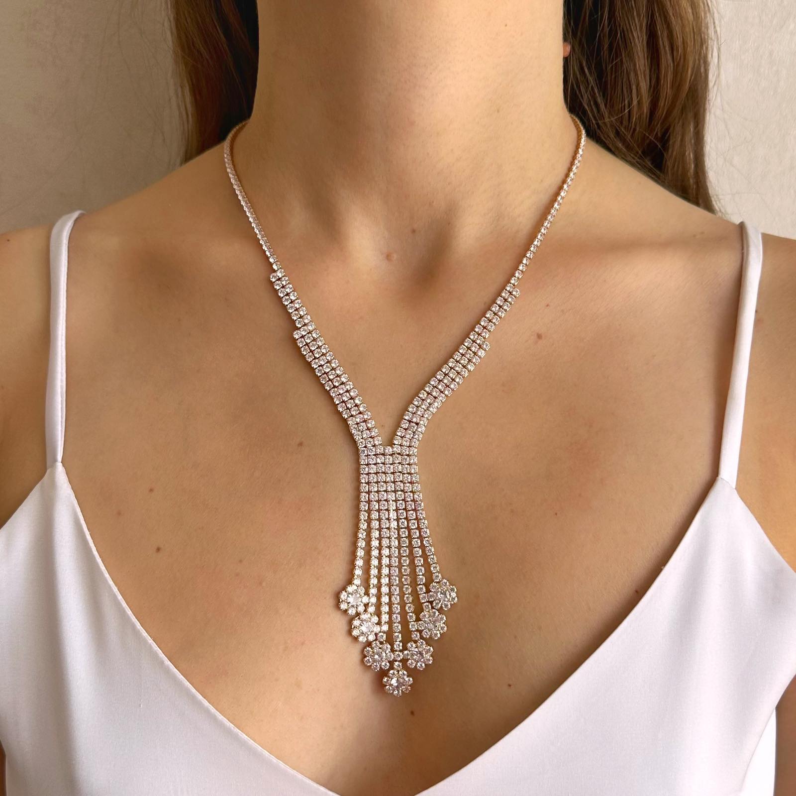 Delikatny naszyjnik ślubny w żółtym złocie z motywem kwiatowym marki YJ Yvette Jewelry nie zawiera niklu; został wykonany ze stopów jubilerskich techniką galwanizacji złota. Metoda ta opiera się na zanurzeniu stopu jubilerskiego w kąpielach galwanicznych metali szlachetnych. Powłoka złota podczas nakładania na stop tworzy dość grubą warstwę ochronną w celach zapobiegania korozji stopu znajdującego się pod nią. Dzięki powłoce galwanicznej komplet nie będzie zmieniał swojego koloru oraz zachowa piękny połysk przez bardzo długi okres czasu.